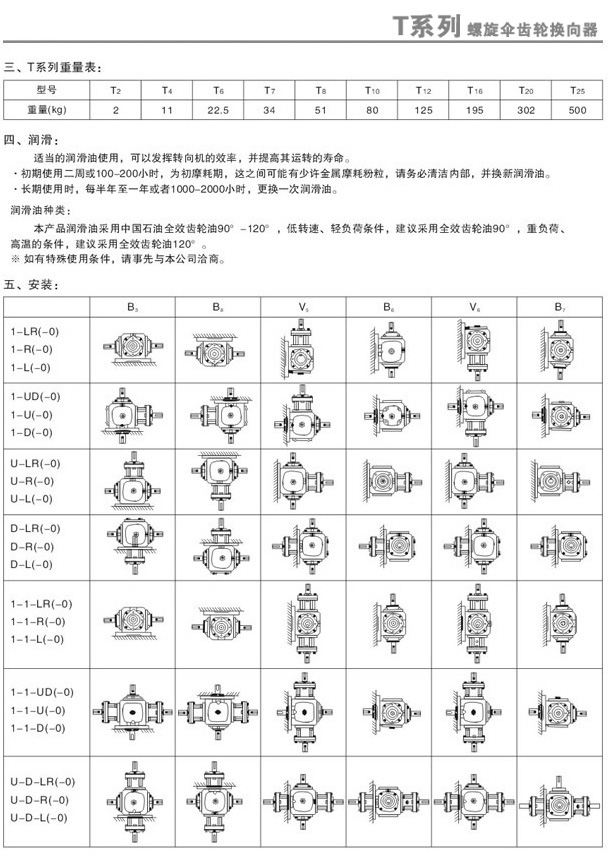 比如: T6-1:1-1-L 與 T6-1:1-1-R ,了解一點英語的記這個就很方便了: Left,左; Right:右。 表示輸出軸一個在左一個在右。 如果是 T6-1:1-1-LR , 表示輸出雙軸,有左有右,即雙軸輸出。 如果后面加了-O, 比如 T6-1:1-1-L-O, 這是用來與 T6-1:1-1-L 區(qū)分的。仔細看這兩個圖形,你會發(fā)現(xiàn),他們的外形一樣,只是內(nèi)部的傘齒輪一個在左一個在右,這樣配置的目的就是使輸出軸的旋轉(zhuǎn)反個方向。