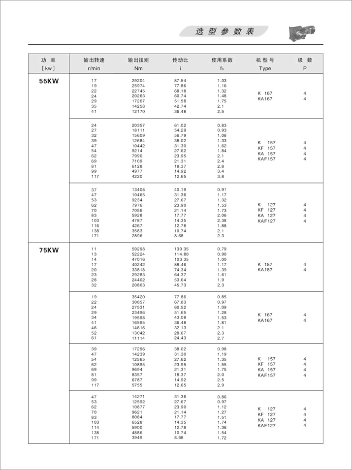 K螺旋錐齒輪減速機選項參數(shù)表45KW、55KW、75KW